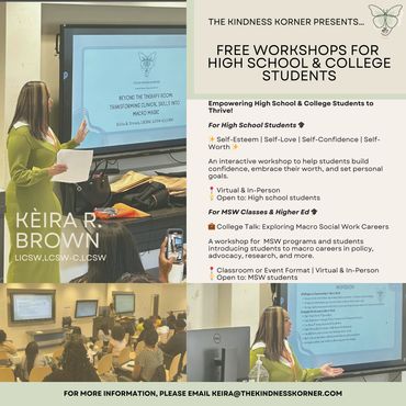 The Kindness Korner offers impactful speaking engagements that bridge clinical and macro social work, focusing on resilience, advocacy, and trauma-informed practices. Our presentations are designed to inspire and equip individuals, professionals, and organizations with the tools to navigate challenges and foster meaningful change.